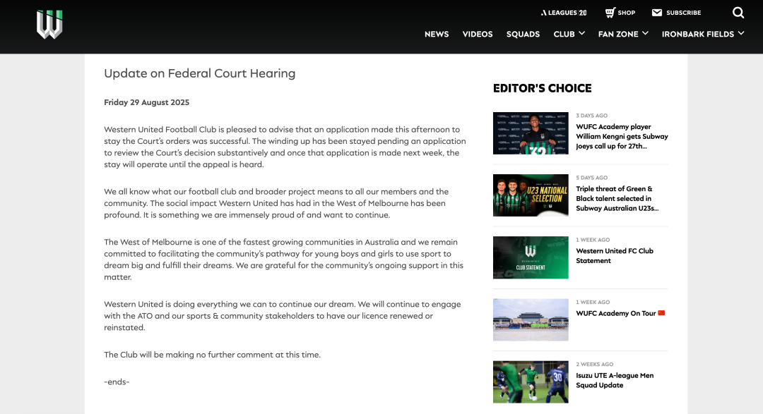 而就在8月29日,澳大利亚联邦法院做出裁决,澳超球队西部联正式解散。根据介绍,联邦法院驳回了该俱乐部所有人提出的延期申请,裁定支持澳大利亚税务局(ATO)解散这家足球俱乐部以及其他几家资不抵债公司的请求。然而就在当天稍晚时间,西部联俱乐部再次发声表示,提交的暂缓执行法院命令的申请已获得批准。清算程序已暂停,等待下周提出实质性审查法院裁决的申请,一旦申请提交,暂停将持续至上诉得到审理为止。